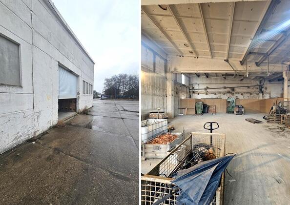 Mehr zum Angebot Kalt-Lagerhalle mit 2 elektr. Rolltoren, fast pfeilerfrei - zus. Freifläche möglich: